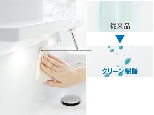 水栓金具をバックガード上部へ設置した、よごれにくい設計。ボウルは継ぎ目のない一体成型なので、拭き掃除も簡単です。
