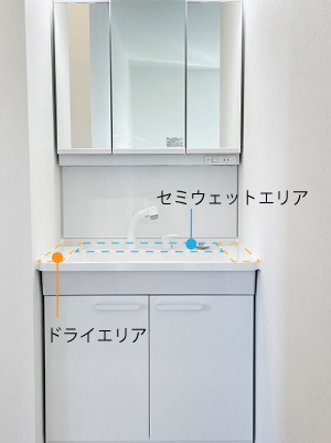 一段低い位置にコップや石けんなど濡れたものを置ける「セミウェットエリア」と