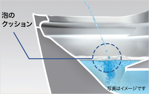 ボタンの操作などで便座を上げると水位が下がり、水面全体に泡が出てきます。泡でトビハネをおさえ、床や壁などへの汚れを抑制します。