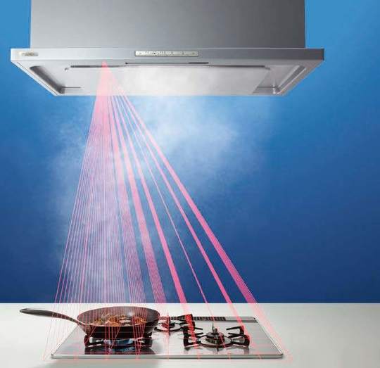 【8×8複眼タイプ】温度センサーが調理状況に応じて自動で風量を調節。油煙の広がりを抑えて、省エネ運転も実現します。