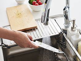 下ごしらえ中のちょっとした洗い物。差し出すだけで早く洗えるから、調理のリズムを崩しません。