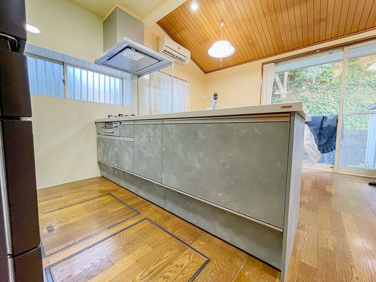 勾配天井との空間分けがバッチリと相まって、グーンっとおしゃれで明るい開放的なキッチン空間に生まれ変わりました!!