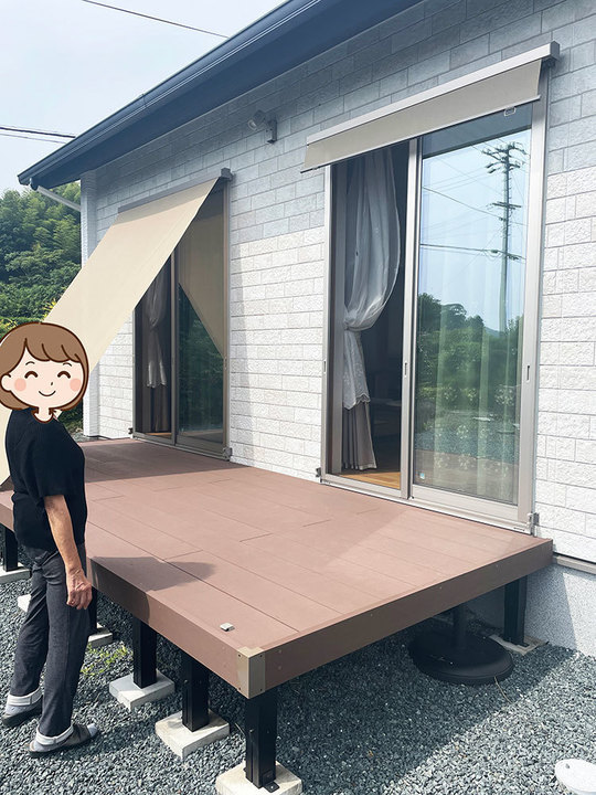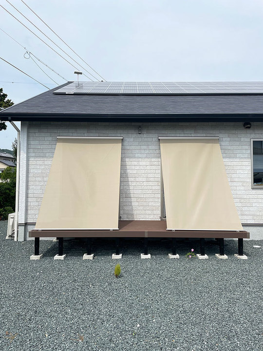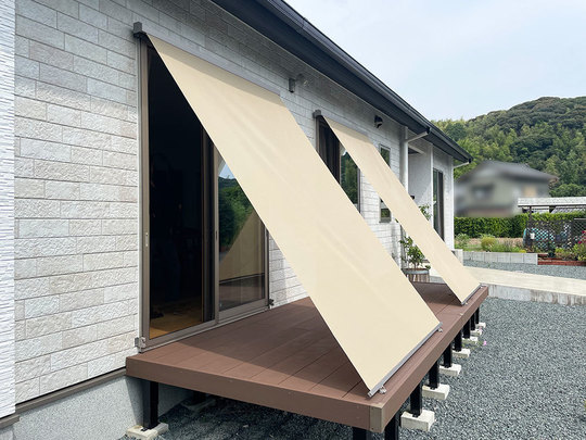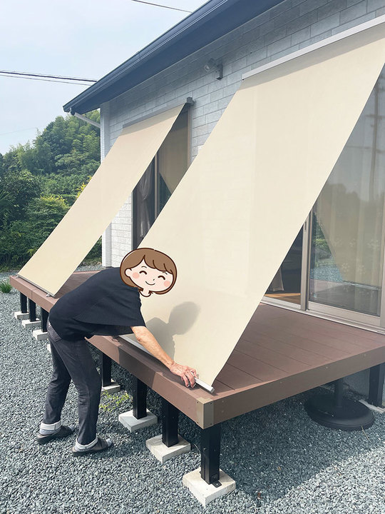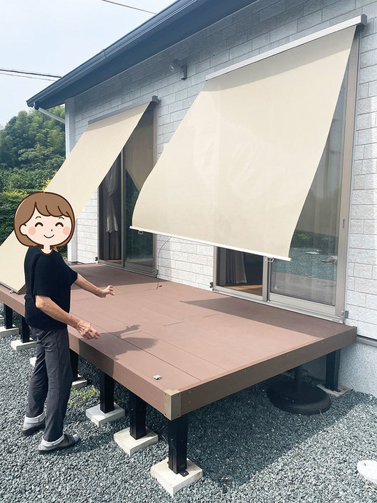 スタイルシェードなら出したり、しまったりがが簡単!!スムーズ!! 台風や風が強いときなど、よしずやすだれなどは外して畳んで倉庫に入れて、いるときはまた繰り返す。。。サッとしまえるのって楽チン♪