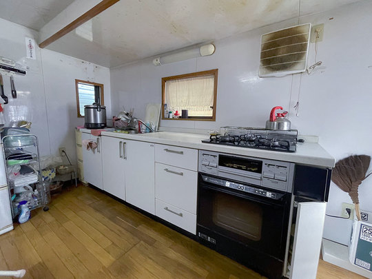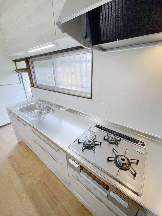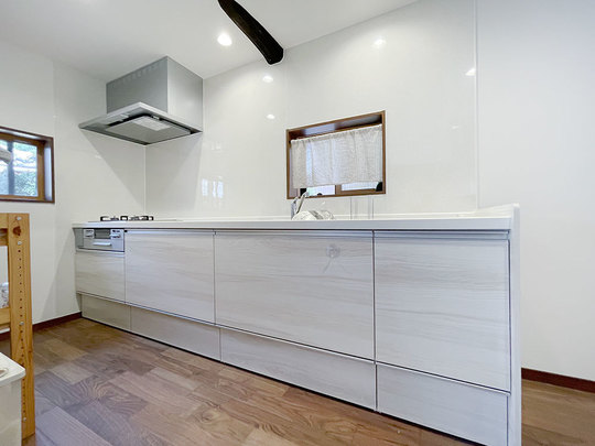 レンジフードに憧れていたとお施主様。2面の窓に、明るく、大きいキッチンが素敵!!梁が歴史と現代を調和して、魅力的な雰囲気になりました。【クリナップ:KT】