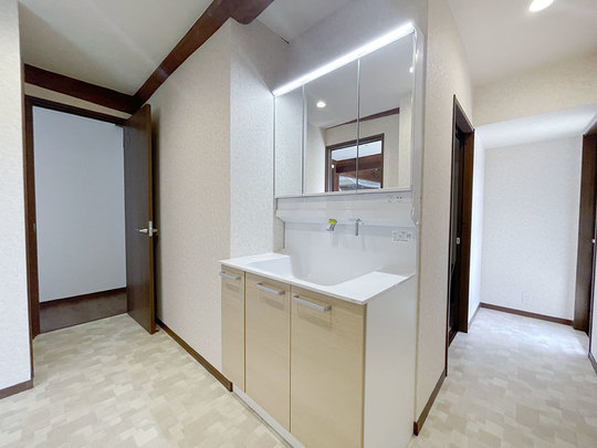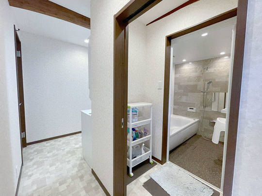 フローリング面積をどんと広げ、水まわりと居住スペースを分けました。キッチンだった場所にバスルームが来たり、脱衣・洗面スペースにはキッチンが来たり、かなり大掛かりな間取りの変更もあった、フルリノベーションになりました。