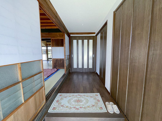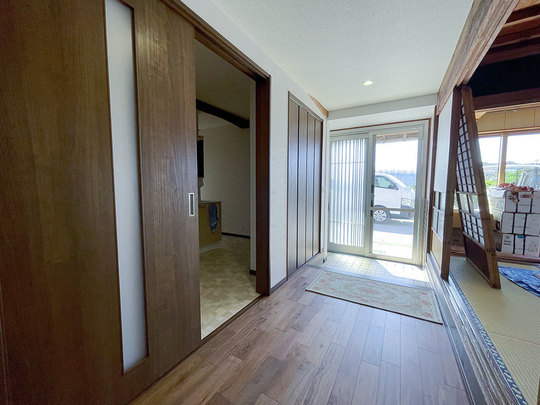 フローリングや建具が以前より暗い色を使っているが、クロスと玄関引戸で明るさをキープ!グッと現代風な雰囲気になりました。