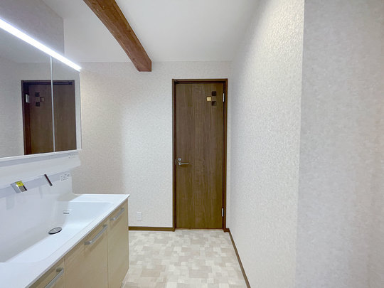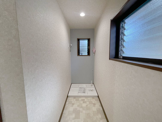 今までは外にあった洗濯機を置くスペースになりました。クロスも変えてかっこいい!!