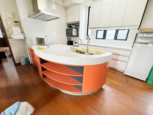オーダーカウンターの形が丸型になっている特殊なキッチンとカラーリングでした。