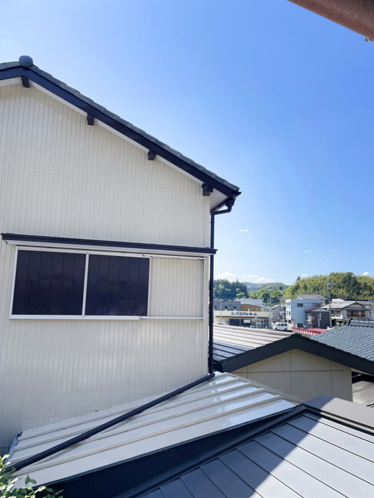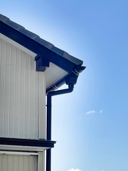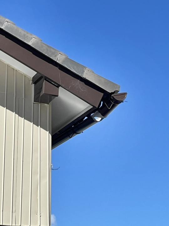軒樋から、集水器・エルボ・竪樋が付きました。軒樋を支える、金物も古くなってきていたため、交換しています。