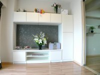 ◆テレビを置く飾り棚も白を基調に仕上げました。