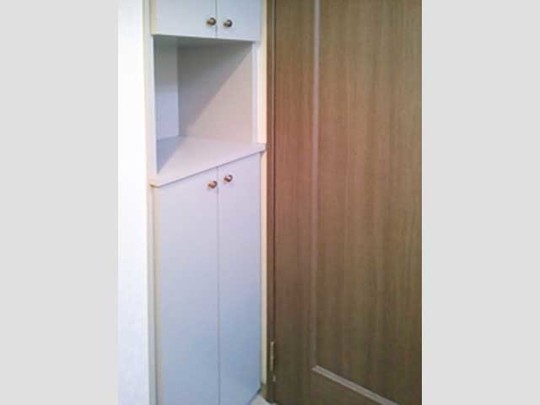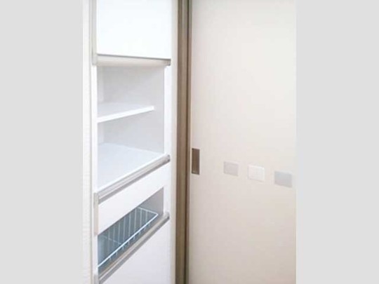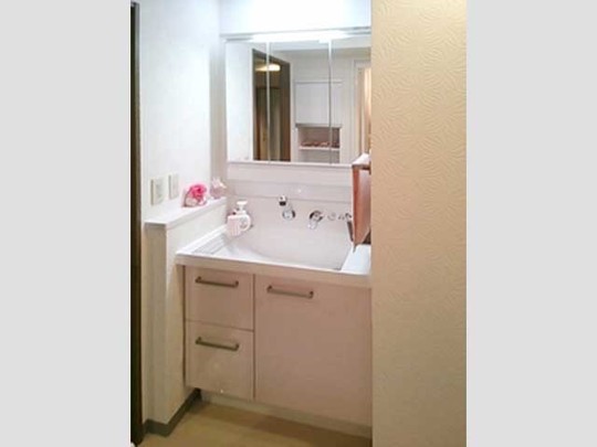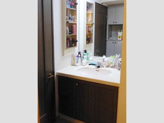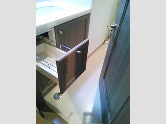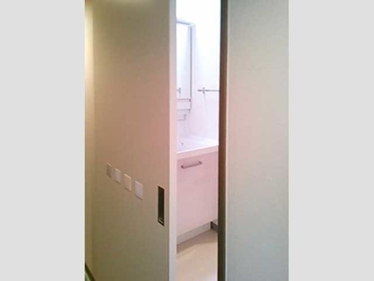 以前は、洗面化粧台の引き出しとドアが接触してしまう状態でしたが、引き戸にすることでスッキリしました。