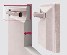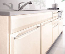 ぼんだ扉と幅広引手を採用した、使いやすい扉です。扉そのものにくぼみを設けた出っ張りの少ない安全設計です。