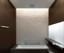 間接照明によるやわらかな光の陰影と細部にまでこだわりぬいた壁・床・水栓。心も身体もリラックスできるTOTOの最高級バスルーム「シンラ」。