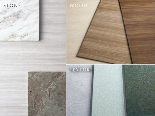 天然素材を再現した石目調や木目調に加え、コンクリート調やガラス調など、豊富な壁柄が揃っています。