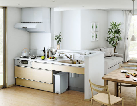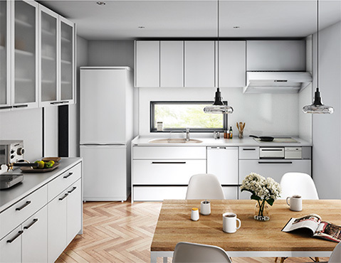 やわらかな光が似合うペールメープルの扉と白いカウンター。全体の明るさと開放感がより際立つナチュラル空間。