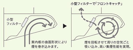 案内板の局面形状により、煙を水平渦巻き状態にキープしつつ吸い込むことで、フィルターが油汚れを本体に入る手前でしっかり吸着します。これがトクラス独自の「フロントキャッチ方式」。レンジフード内部のお手入れをしなくても、性能上の問題はありません。