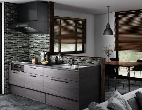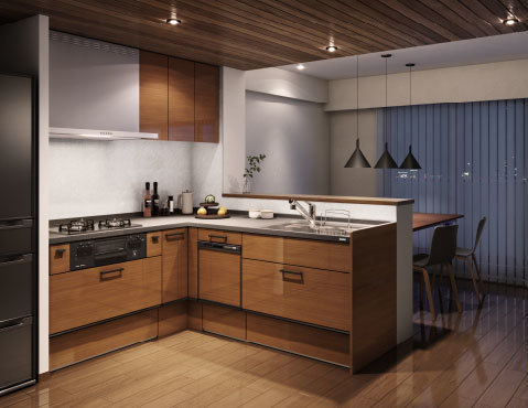 光沢のある木目扉と黒いカウンターで落ち着きがありながら開放的なL型キッチン。