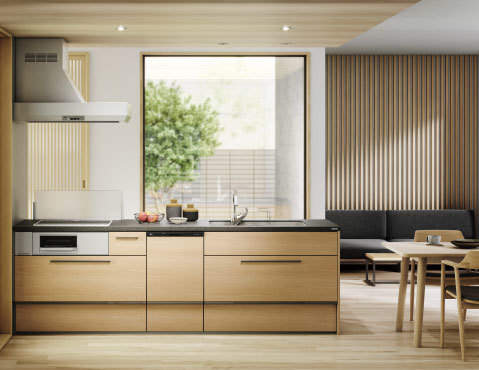 シンクやカウンターは、もちろんすべてトクラス独自の人造大理石を使っているため、汚れ、キズ、衝撃、熱に強く、気兼ねなく使えます。カウンタースペースとシンクは幅800mmと余裕の広さです。