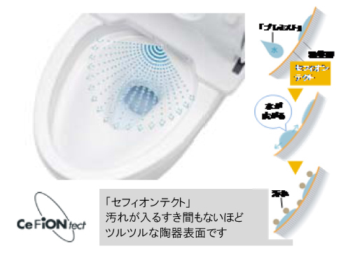 ツルツル表面で水と相性のよいセフィオンテクトだからミストが便器表面に広がり、汚れをつきにくく、落ちやすくします。